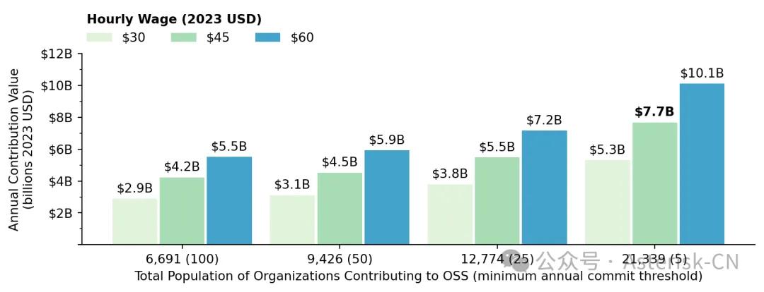 在不同情况下组织对开源软件的全球年度贡献价值估算。我们对以下假设进行了调整:(1)全球有多少组织为开源软件做出贡献,以及(2)做出贡献的员工获得多少工资。我们使用GitHub公开提交数据,通过提交者的公司邮箱地址将其与组织进行匹配,以估算做出贡献的组织总数。例如,根据我们的数据,有6,691个不同的组织在一年内进行了100次提交。我们首选的阈值是每年5次提交(21,399个组织),首选的工资估算是45美元(2023年美元),这与Hoffmann、Nagle和Zhou(2024)的研究保持一致。