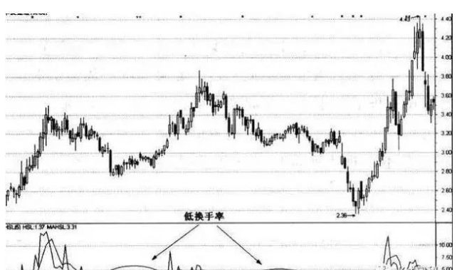 在多数情况下,过低或过高的换手率是股价变盘的先行指标。一般而言,在股价出现长时间调整后,如果连续一周多的时间内换手率都保持在极低的水平(如周换手率在2%以下),则往往预示着多空双方都处于观望之中。由于空方的力量已经基本释放完毕,此时的股价基本已进入底部区域,此后很容易出现上涨行情。