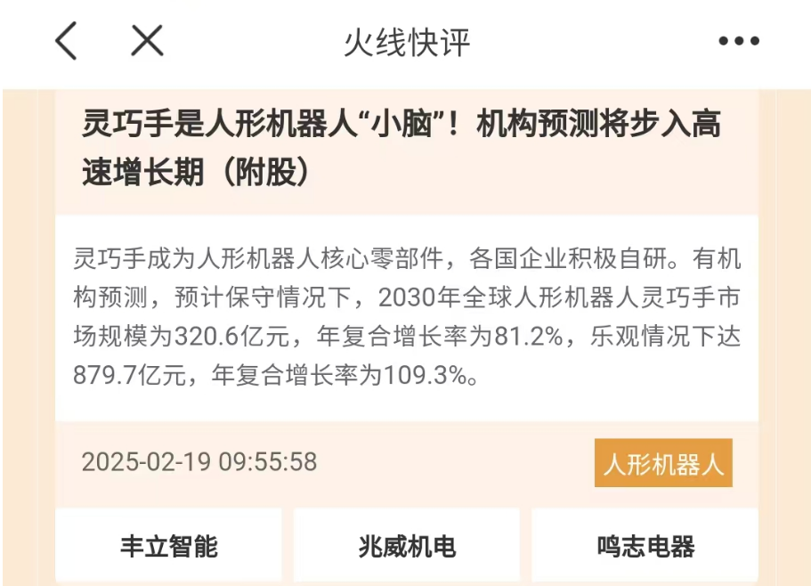 此外,多位选手运用每日经济新闻私人订制的火线快评取得了不错的收益。在“火线快评”中,2月19日开盘前提到人形机器人概念,相关个股丰立智能、鸣志电器均大涨。多位选手表示,大赛的福利真不错,只要报名比赛,就能免费查看火线快评。