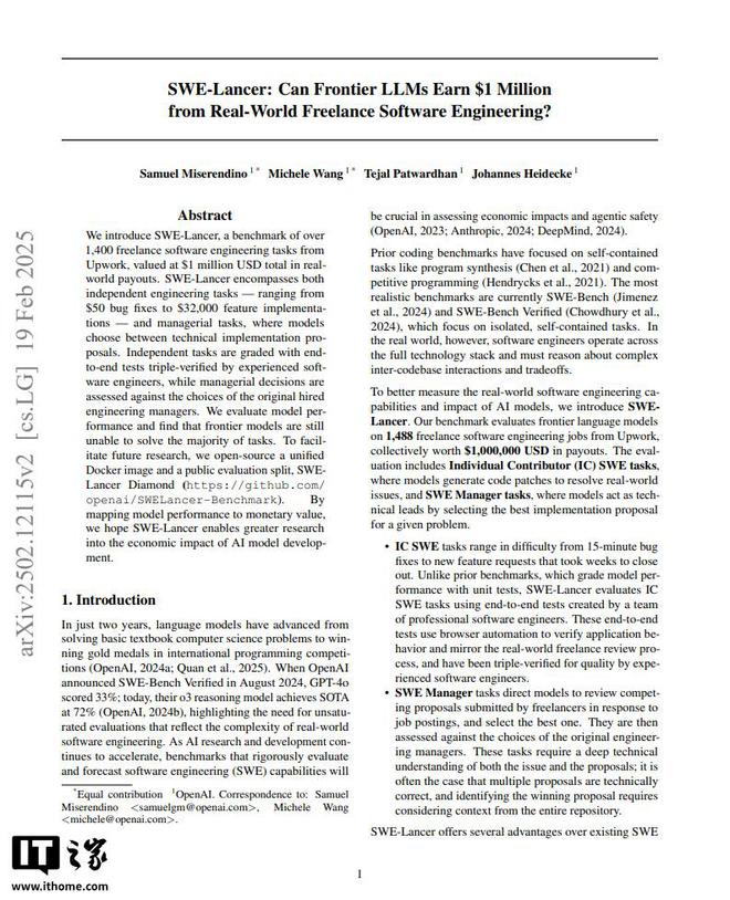 研究人员在一篇新论文中指出,即使是前沿模型 —— 即那些最具创新性和突破性的 AI 系统 ——“仍然无法解决大多数”编程任务。为此,研究人员开发了一个名为 SWE-Lancer 的新基准测试工具,该工具基于自由职业者网站 Upwork 上的 1400 多个软件工程任务。通过这一基准测试,OpenAI 对三款大型语言模型(LLMs)进行了测试,分别是其自身的 o1 推理模型、旗舰产品 GPT-4o,以及 Anthropic 公司的 Claude 3.5 Sonnet。
