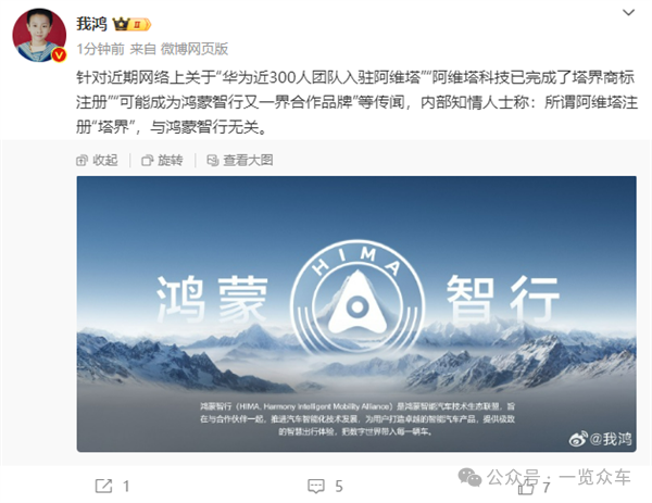 2月24日,华为内部鸿蒙智行相关负责人公开发布微博称:针对近期网络上关于“华为近300人团队入驻阿维塔”、“阿维塔科技已完成了塔界商标注册”、“可能成为鸿蒙智行又一界合作品牌”等传闻,所谓阿维塔注册“塔界”,与鸿蒙智行无关。
