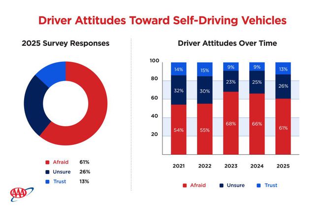 据IT之家了解,AAA 对 888 名受访者进行的调查显示,消费者对自动驾驶汽车的信任度从去年的 9% 略微上升至 13%。然而,仍有 61% 的驾驶员对自动驾驶汽车感到害怕,26% 的人表示不确定。此外,消费者对技术持续发展的热情也在下降,从 18% 降至 13%。与此同时,78% 的美国人希望汽车制造商优先提升汽车安全系统。