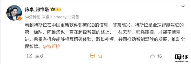 IT之家 2 月 26 日消息,阿维塔科技总裁 @陈卓_阿维塔 今日发文谈到特斯拉在华更新软件表示,“看到特斯拉在中国更新软件部署 FSD 的信息,非常高兴。特斯拉是全球智能驾驶的第一梯队,阿维塔也一直在超级智驾的路上,一往无前。强强碰撞,才能不断精进,希望有机会能够相互切磋体验,取长补短,共同推动智能驾驶的发展,推动全民智驾。”末尾,陈卓还 @了特斯拉官微。