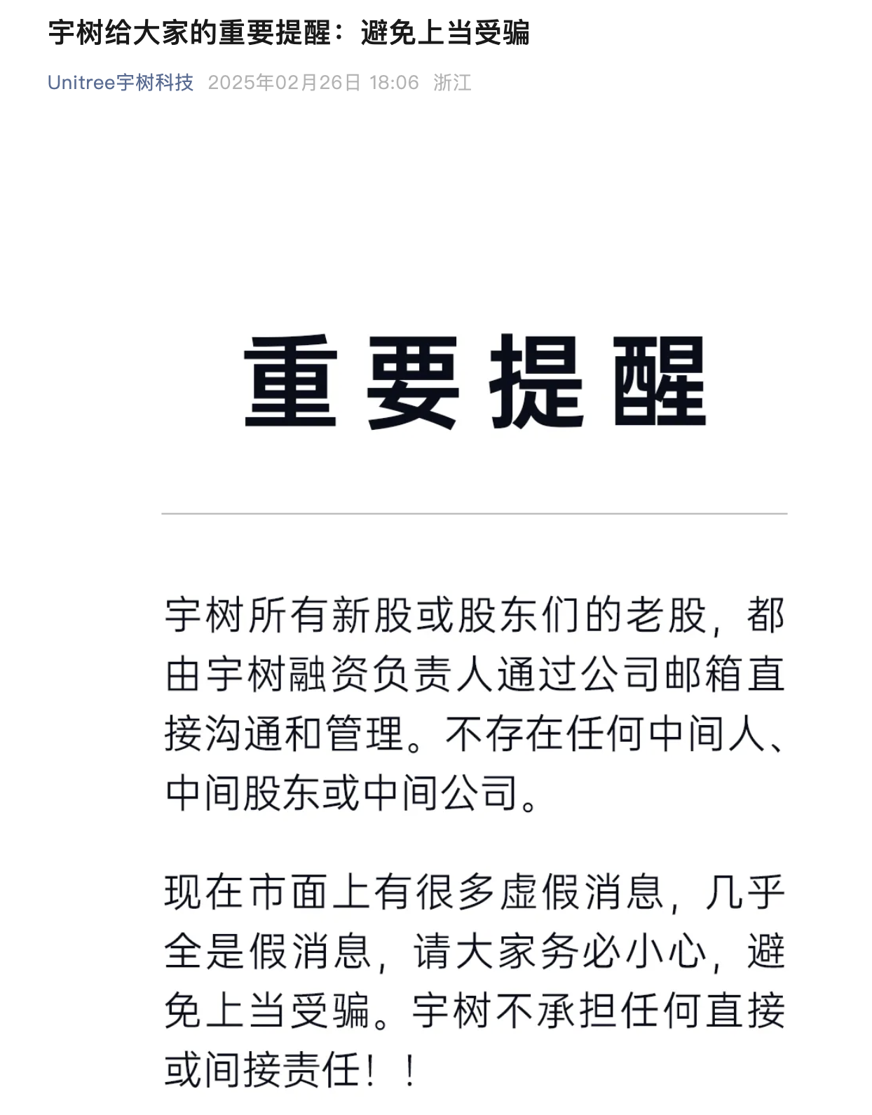 2月26日,宇树科技官微发布提醒,宇树所有新股或股东们的老股,都由宇树融资负责人通过公司邮箱直接沟通和管理。不存在任何中间人、中间股东或中间公司,现在市面上有很多虚假消息,几乎全是假消息。请大家务必小心,避免上当受骗。