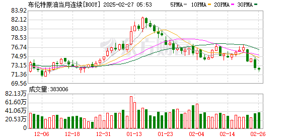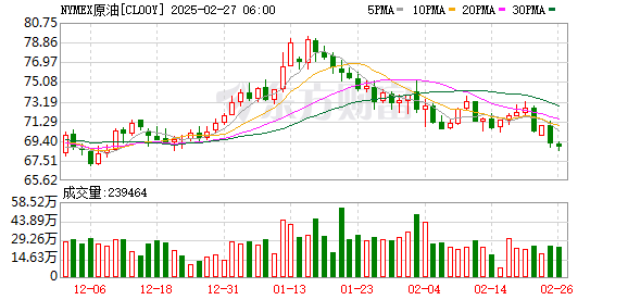 商品市场:国际油价26日下跌。截至当天收盘,纽约商品交易所4月交货的轻质原油期货价格下跌31美分,收于每桶68.62美元,跌幅为0.45%;4月交货的伦敦布伦特原油期货价格下跌49美分,收于每桶72.53美元,跌幅为0.67%;5月交货的伦敦布伦特原油期货价格下跌43美分,收于每桶72.07美元,跌幅为0.59%。国际金价当日上涨,COMEX黄金期货上涨11.80美元,涨幅0.40%,报2930.60美元/盎司。