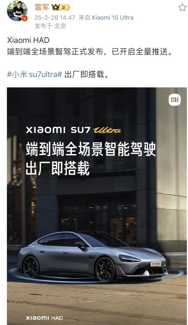 电动知家消息,2月26日,小米董事长兼CEO雷军发布微博表示,Xiaomi HAD端到端全场景智驾正式发布,已开启全量推送。小米SU7 Ultra出厂即搭载。