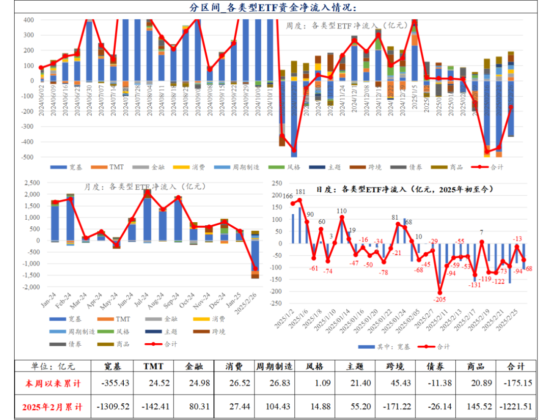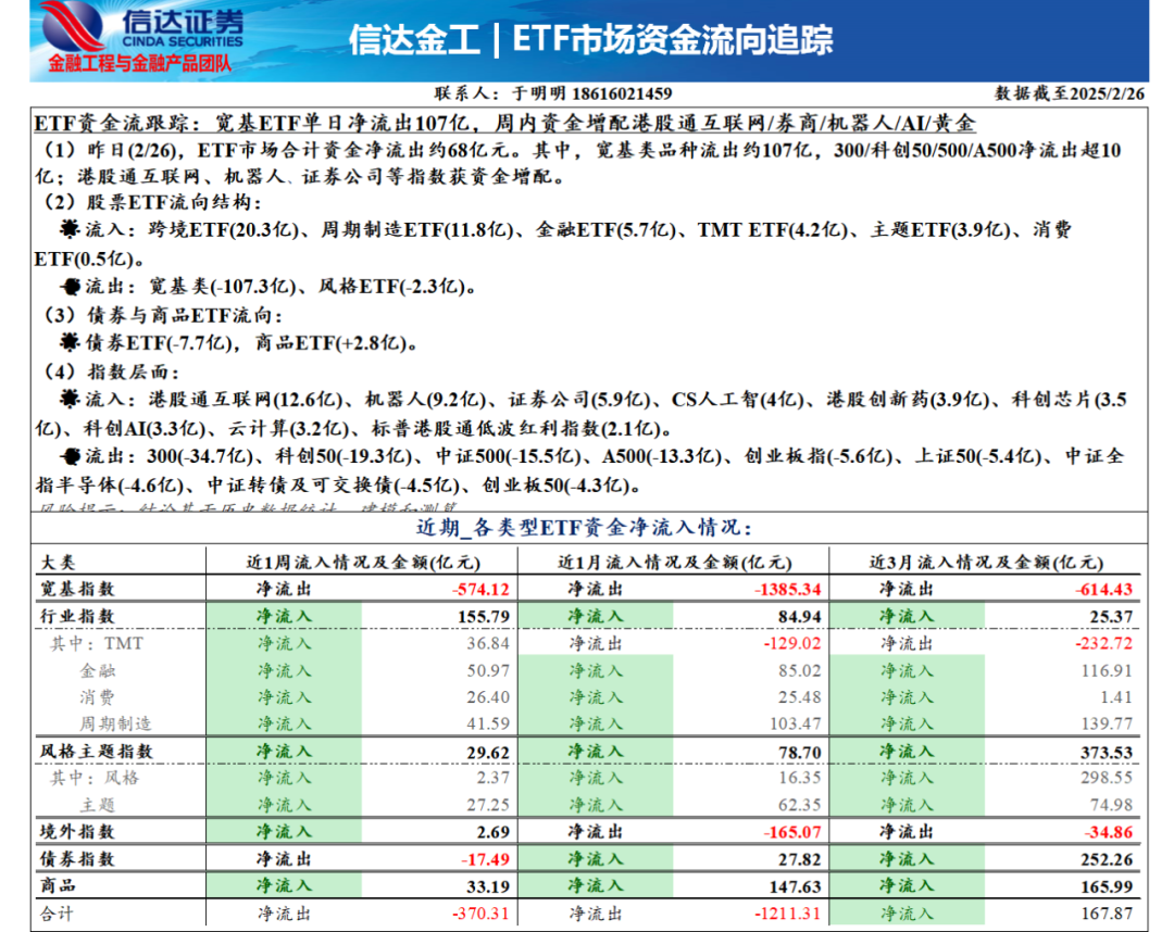宽基ETF单日净流出107亿,周内资金增配港股通互联网/券商/机器人/AI/黄金——ETF资金流向监测