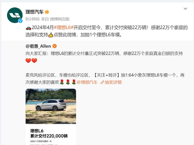 每经AI快讯,2月26日,理想汽车在微博发文称,理想L6开启交付至今,累计交付突破22万辆。