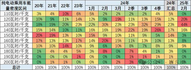 近几年纯电动车电池的能量密度提升缓慢,2025年逐步市场化推动技术提升,体现乘用车的产品脱离补贴的实际效果较好。130瓦-140瓦时左右的车型推出增多。