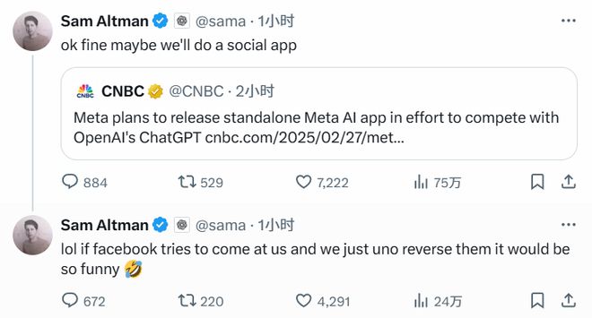 北京时间今日清晨,OpenAI 创始人奥尔特曼在平台幽默回应这一消息:OK,也许我们会做一个社交应用。“哈哈!如果 Facebook 想对付我们,我们直接用 UNO 牌反将一军,想想都有趣!”