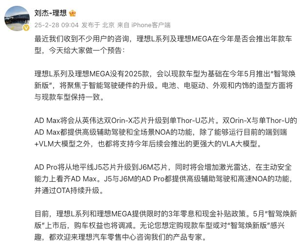 2月28日上午,理想汽车副总裁刘杰在微博发文透露,理想L系列及理想MEGA没有2025款,会以现款车型为基础在今年5月推出“智驾焕新版”,电池、电驱动、外观和内饰的造型方面将与现款车型保持一致。此外,AD Max将会从英伟达双Orin-X芯片升级到单Thor-U芯片,AD Pro将从地平线J5芯片升级到J6M芯片,同时将会增加激光雷达。