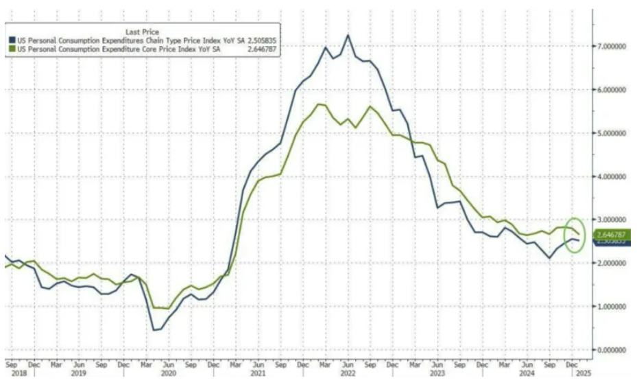 北京时间2月28日晚间,美国商务部最新公布的数据显示,美国2025年1月PCE物价指数同比上涨2.5%,符合预期,且低于前值的2.60%;环比上涨0.3%,亦符合预期,前值为0.3%。