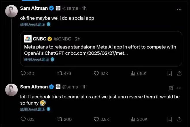 OpenAI创始人奥特曼称:OK,也许我们会做一个社交应用。“哈哈!如果Facebook想对付我们,我们直接用 UNO 牌反将一军,想想都有趣!”