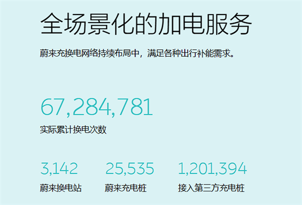 补能方面,截至目前,蔚来累计建成3142座换电站,累计换电6.7亿次,并建成25535根充电桩,接入120万根第三方充电桩。