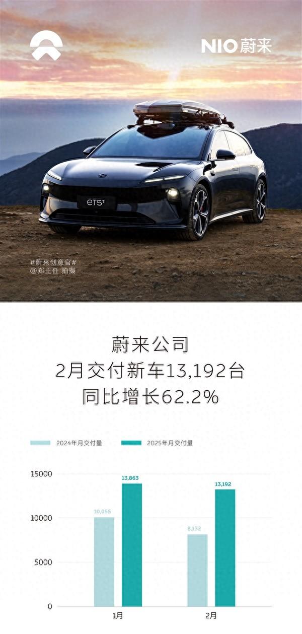 在刚刚过去的2月份,蔚来公司交付新车13192台,同比增长62.2%。