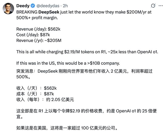 敏锐的网友——如 MenloVentures 投资人 Deedy 翻译了这意味着什么:「理论 ARR 2 亿美金、利润率超过 500%,这样的商业效率理应是一家值 100 亿美金的公司。」