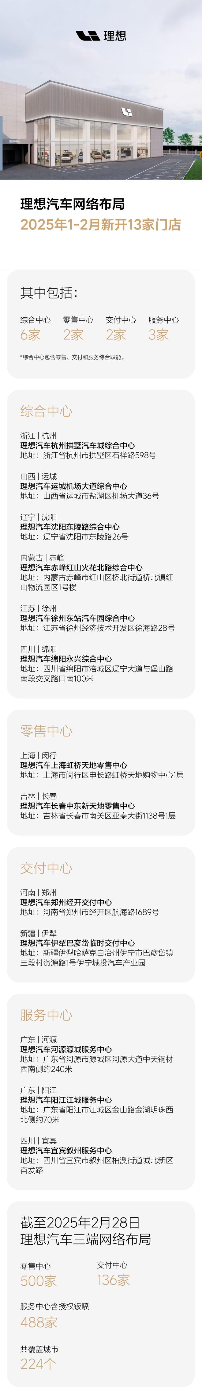 IT之家 3 月 2 日消息,理想汽车昨日晚公布了网络布局新进展,其 2025 年 1-2 月新开 13 家门店。其中综合中心 6 家(综合中心包含零售、交付和服务综合职能)、零售中心 2 家、交付中心 2 家、服务中心 3 家。截至 2025 年 2 月 28 日,理想汽车三端网络布局如下: