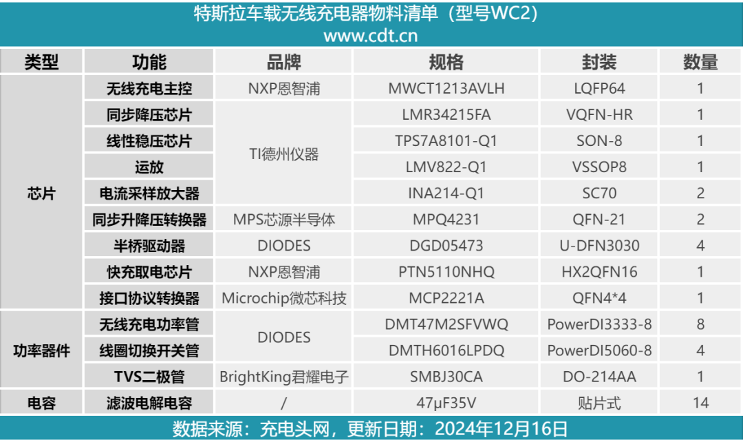最后附上特斯拉WC2车载无线充电器的核心器件清单,方便大家查阅。