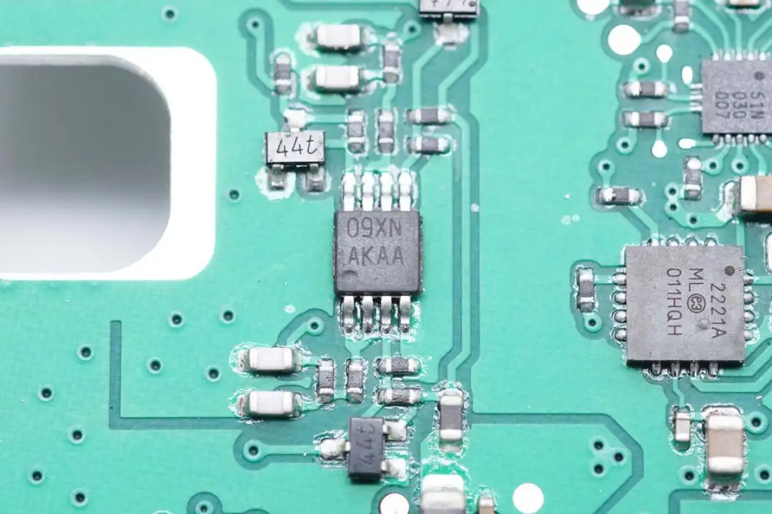 双运放来自TI德州仪器,丝印AKAA,型号LMV822-Q1,为汽车级AEC-Q100 1级版本,采用VSSOP8封装。