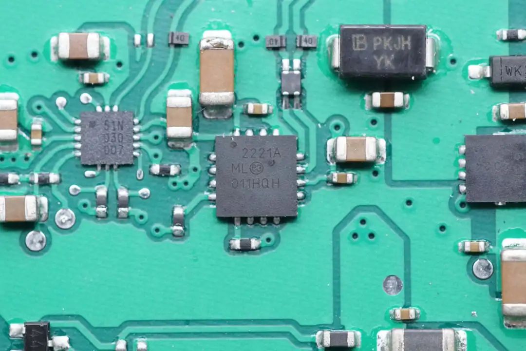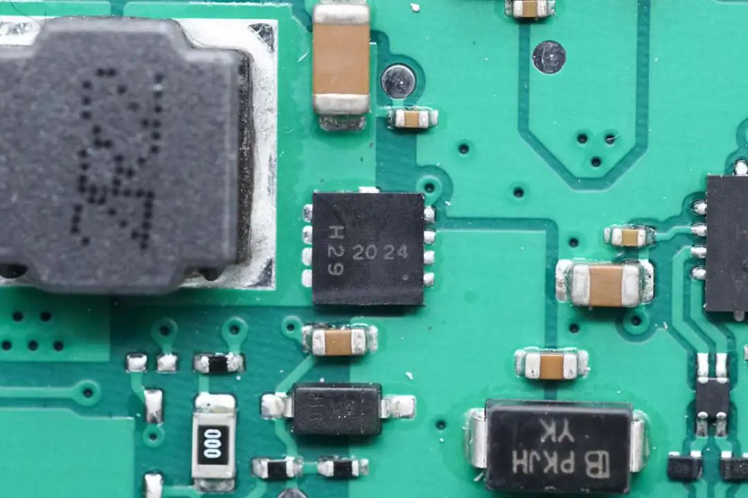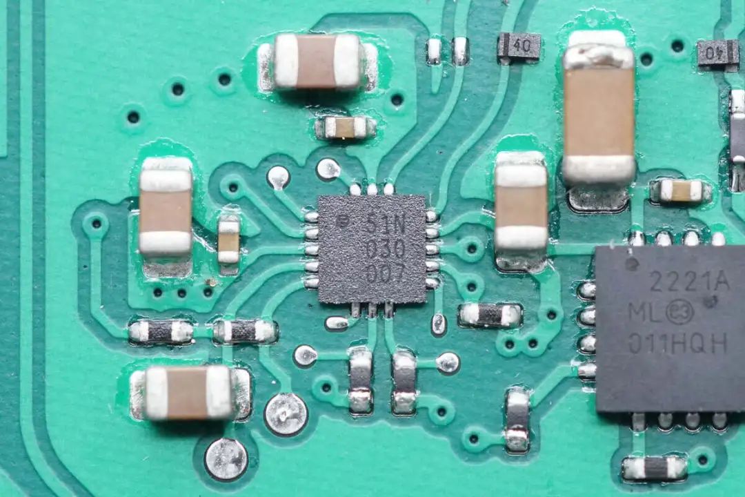 快充取电芯片来自恩智浦,丝印51N,实际型号PTN5110NHQ,是一颗USB PD物理层芯片,具备I2C接口,用于MCU与USB-C接口通信,采用HX2QFN16封装。