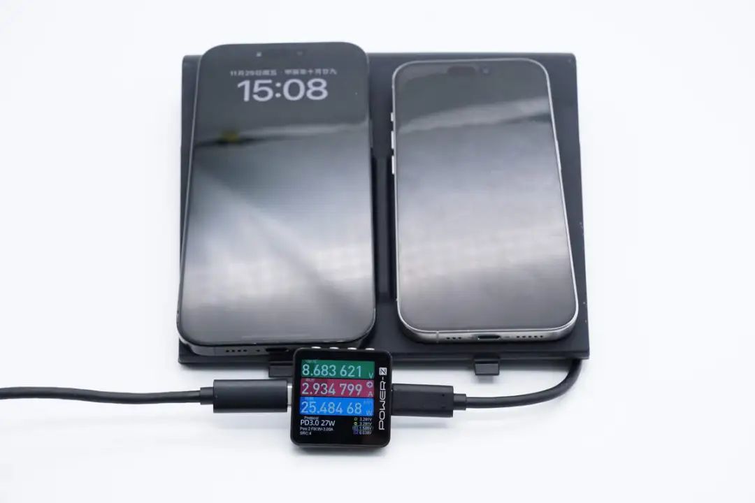 使用无线充电器同时为iPhone 16 Pro Max和iPhone 15 Pro手机无线充电。