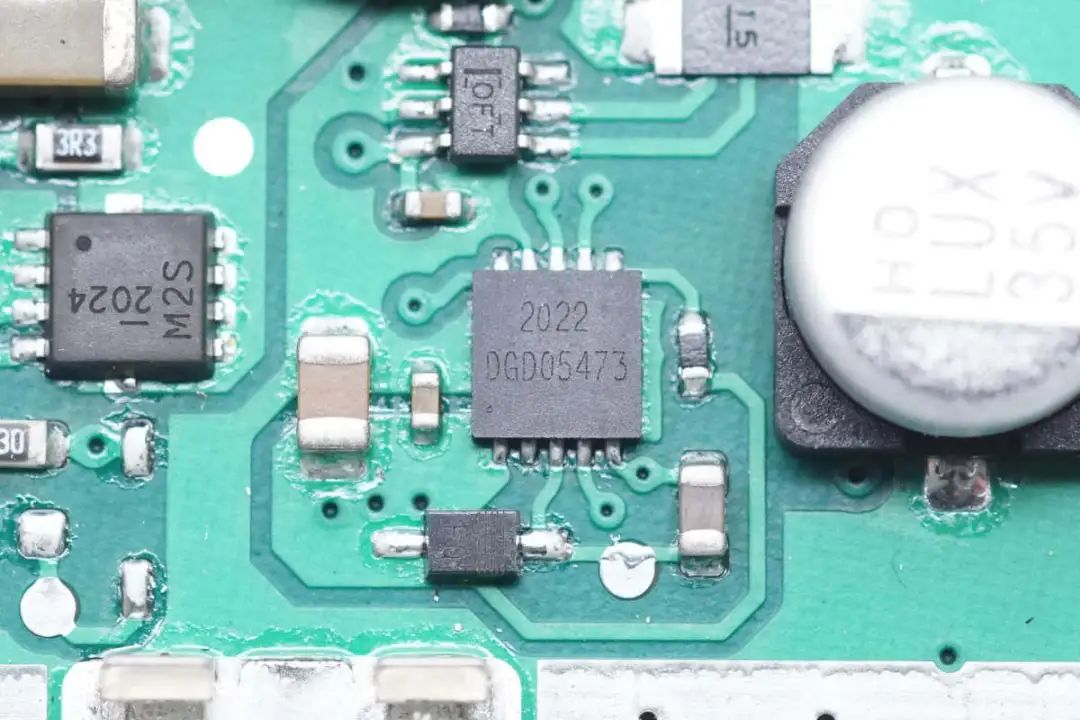 PCBA模块正面一览,左右两侧为无线充电同步升降压电路,驱动器,无线充电功率管和线圈切换MOS管,中间位置为无线充电主控、快充取电芯片、开关降压电路和线性稳压芯片。