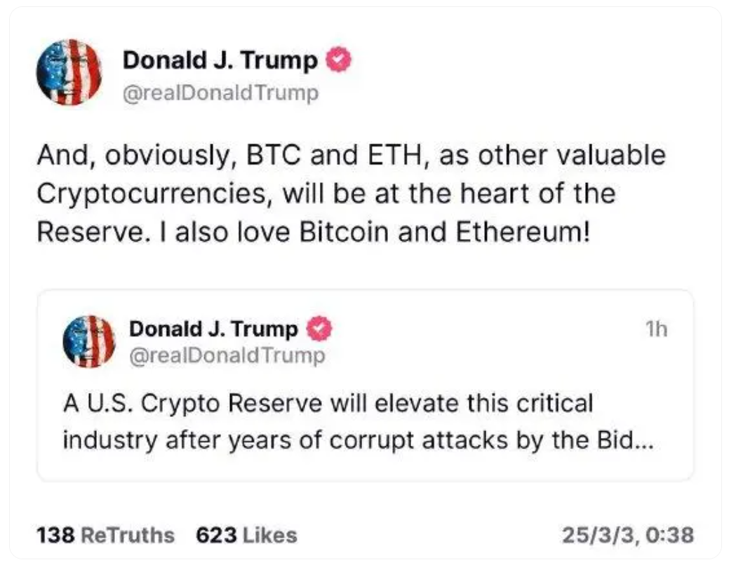 随后,特朗普又发布了一条消息:“显然,比特币(BTC)和以太坊(ETH)作为其他有价值的加密货币,将成为储备的核心。”