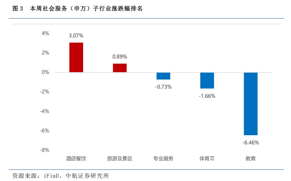 酒店餐饮(3.07%)、旅游及景区(0.89%)、专业服务(-0.73%)、体育Ⅱ(-1.66%)、教育(-6.46%)。