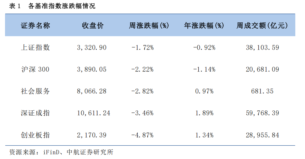 各基准指数周涨跌幅情况为:上证指数(-1.72%)、沪深300(-2.22%)、社会服务(-2.82%)、深证成指(-3.46%)、创业板指(-4.87%)。