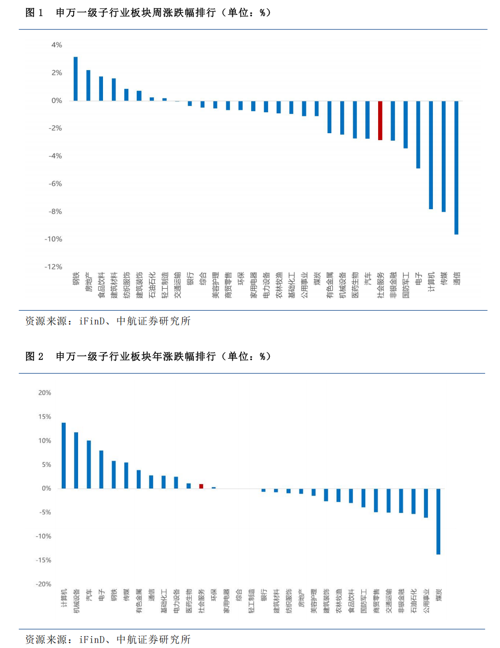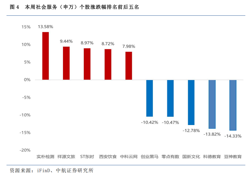 分子行业来看,本周社会服务各子行业涨跌幅排名: