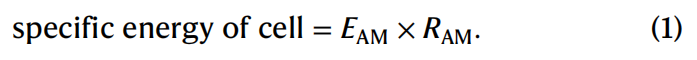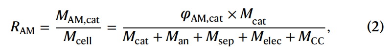 其中,MAM,cat是正极活性材料的质量载量,而φAM,cat是正极中活性材料的质量分数。此外,Mcell代表电池的总质量,包括电化学活性组分的质量(即正极Mcat)和负极Man以及非活性组分的质量即隔膜Msep、电解液Melec和集流体Mcc。包装材料的质量未包含在这一计算中,因为它会因电池类型而异。同时,EAM是活性材料的比能量,其计算公式为: