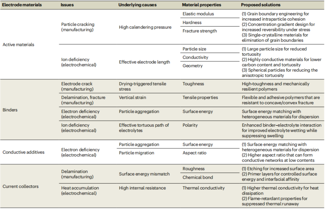 图3. 高面积容量电池电极的电化学挑战。可扩展高面积容量电极的材料化学