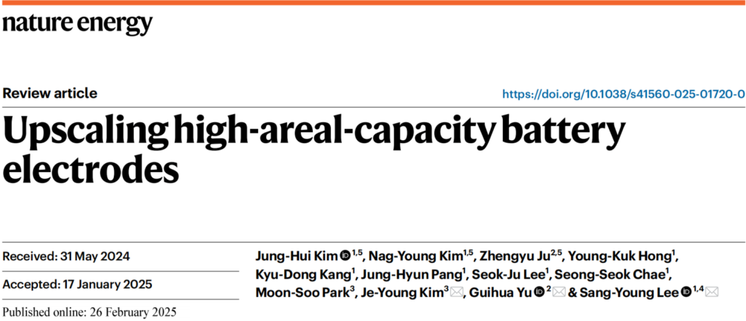 Jung-Hui Kim, Nag-Young Kim, Zhengyu Ju, Young-Kuk Hong, Kyu-Dong Kang, Jung-Hyun Pang, Seok-Ju Lee, Seong-Seok Chae, Moon-Soo Park, Je-Young Kim, Guihua Yu, Sang-Young Lee, Upscaling high-areal-capacity battery electrodes, Nature Energy, https://doi.org/10.1038/s41560-025-01720-0