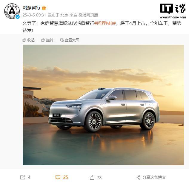 IT之家 3 月 5 日消息,鸿蒙智行问界 M8 官宣 4 月上市,定位“家庭智慧旗舰 SUV”,号称全能车王。
