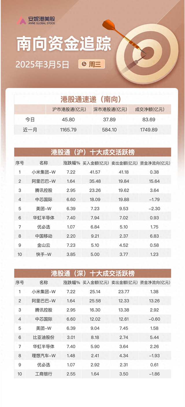 大幅净买入:阿里巴巴-W(09988.HK)28.90亿港元;腾讯控股(00700.HK)6.56亿港元;比亚迪股份(01211.HK)5.44亿港元;华虹半导体(01347.HK)3.19亿港元;优必选(09880.HK)2.36亿港元。