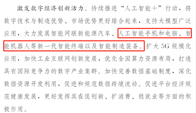3月5日,2025年政府工作报告将"人工智能+"行动与新质生产力深度绑定列为今年的重点工作任务,明确提出将数字技术与制造优势、市场优势更好结合起来,支持大模型广泛应用,大力发展智能网联新能源汽车、人工智能手机和电脑、智能机器人等新一代智能终端以及智能制造装备。