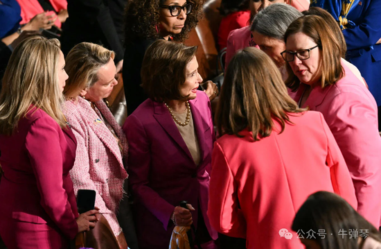 很多民主党女议员,包括佩洛西在内,则都穿了粉红色衣服。