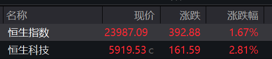 恒指开盘涨1.67%,恒生科技指数涨2.81%。快手、阿里巴巴涨超6%,小鹏汽车涨超4%,腾讯控股涨超3%。
