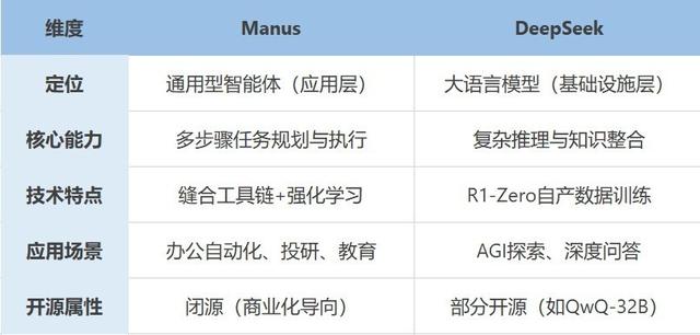 这样看来,Manus更像是一个高级版的DeepSeek,它能在DeepSeek的基础上完成很多额外的工作,将大模型能力转化为实际生产力工具。将时下火热的DeepSeek进行对比,我们也不难发现,DeepSeek更侧重于基础语言处理于分析推理能力,而Manus则更倾向于将抽象指令转化为可交付的成果。