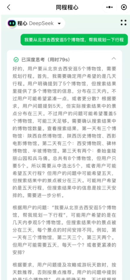 据悉,同程程心AI可为用户提供行程规划、游玩攻略、酒店、景点门票、交通出行等旅行相关的咨询推荐及预订能力,帮助用户实现从信息咨询、资源检索、决策分析到产品预订的一站式体验。接入DeepSeek后,同程程心AI将基于DeepSeek强大的推理能力,为用户提供更精细和智能的决策服务。