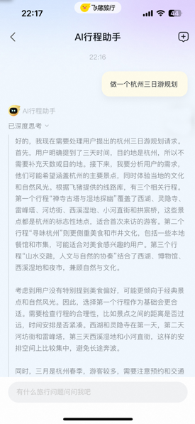 无独有偶,飞猪“AI行程助手”在本周刚刚上线。该产品集成了DeepSeek-R1及阿里云通义千问旗下主力模型的能力。飞猪方面表示,“AI行程助手”可秒级响应用户需求,帮助用户寻找灵感、规划行程、推荐玩法、挑选产品,生成真实、详尽的个性化旅行方案,大幅缩短用户各处搜罗信息及整理攻略的时间。“AI行程助手”并不仅提供简单的文字问答。它还会基于答案生成专属的路线地图。