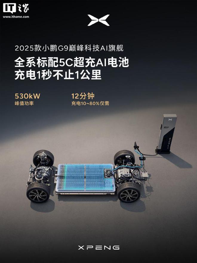 IT之家 3 月 7 日消息,小鹏汽车今日官宣,2025 款小鹏 G9 全系标配 5C 超充 AI 电池,峰值功率 530kW,10%-80% 仅需 12 分钟。