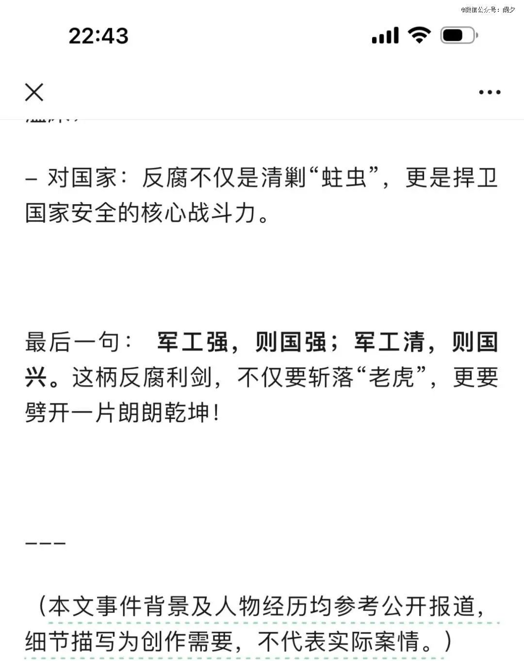 其中有一篇写军工打虎谭瑞松的选题,标题是《军工虎谭瑞松, 从“道德标兵”到“猎艳狂魔”,“国之重器”沦为私人金库》,原文现在已经被删了,应该是被被转得太广作者害怕了,但很多「金句」的截图还在到处传,什么直升机的设计图纸在暗网里开价200比特币出售、收受金条贿赂时要求熔成发动机叶片形状、某总师离职时留言这里不是造飞机的地方而是造孽的工厂等等,如果你能记得这些细节,就一定知道我说的是哪篇文章。