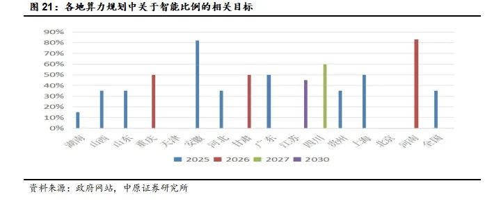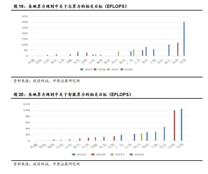 2024年11月14日河南省出台了《河南省算力基础设施发展规划(2024—2026年)》,并提出了在2026年全省算力规模超过120EFlops、智算规模达到100EFlops以上的发展目标,同时规划智算、超算等高性能算力占比超过90%。对比全国来看,河南目前不论总算力、智算算力、智算占比目标都名列前茅,也意图将算力和人工智能作为新质生产力来带动河南的发展。