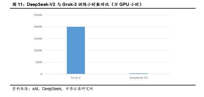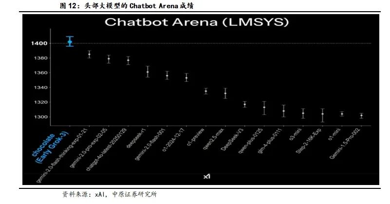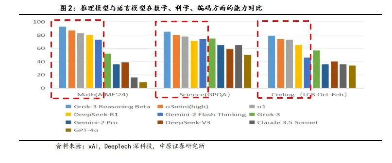 (2)通过大算力投入,带动整体模型能力的提升。这一方法面临Scaling out的质疑,但是从xAI发布的Grok3推理能力赶超DeepSeek-R1来看,堆算力的方式目前暂时有效。在用122天构建出10万GPU数据中心Colossus以后,xAI又用92天将其扩建至20万卡,并在这一硬件基础上完成了对Grok3的训练,累计训练时长达到2亿GPU小时,是Grok2的十倍。