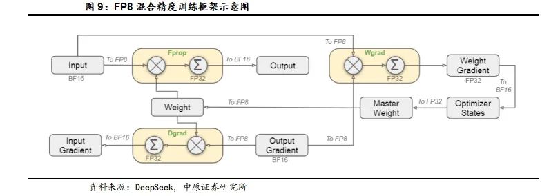 (1)FP8混合精度训练框架:通常在大模型训练中会选用BF16或FP32 / TF32精度进行数据计算和存储,FP8虽然可以提升计算速度和降低存储需求,但是由于计算精度不高,容易损失数据信息。为此,DeepSeek结合自身在GPU硬件架构和训练误差方面强大的整合分析能力,专门设计出了针对FP8的训练框架体系,将大多数计算密集型操作在FP8中进行,而一些关键操作则保持了原有数据格式,兼顾了训练效率和稳定性。DeepSeek也成为了首个成功使用FP8混合精度训练超大规模大模型的公司。