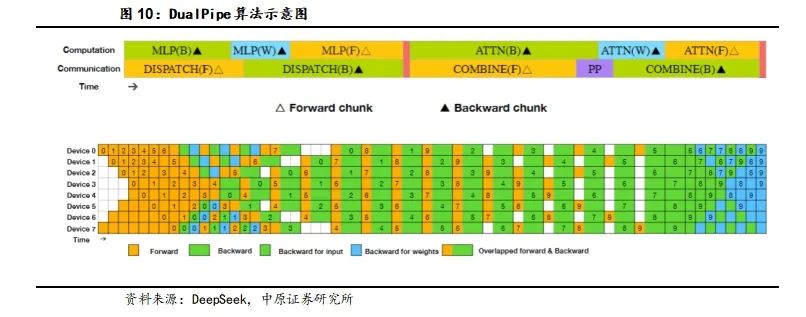 (2)DualPipe算法:实现高效的流水线并行,并通过计算和通信的重叠,隐藏了大模型训练中的大部分通信开销,规避了单个服务器中8个GPU共享一个IB NIC流水线并行期间出现的网络带宽竞争。从下图中可以看到,在代表着8个GPU的流水线并行中,在不同任务的穿插计算中,白色的气泡时间都得到了极大的压缩。