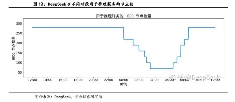 当前DeepSeek用278台H800服务器提供推理服务,对应的GPU数量为2224张。由于DeepSeek在夜间的需求较少,其减少了推理节点,用剩余算力满足自身的研究和训练,平均占用GPU数量为1814张,这个数量是远低于市场预期的。