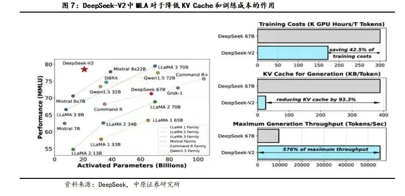 (1)多头潜注意力机制(MLA,对传统多头注意力机制的改进):大概贡献了2-4倍的计算效率提升,该技术首次在DeepSeek-V2中引入。传统的多头注意力的键值缓存(KV Cache)较大,DeepSeek通过将低秩近似方法引入键值缓存压缩中,从而提升了计算效率。