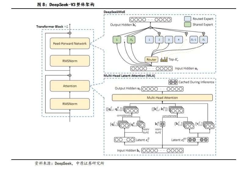 DeepSeek-R1的模型架构主要来自于DeepSeek-V3,DeepSeek-V3的模型架构中减少算力消耗的两个关键点包括: